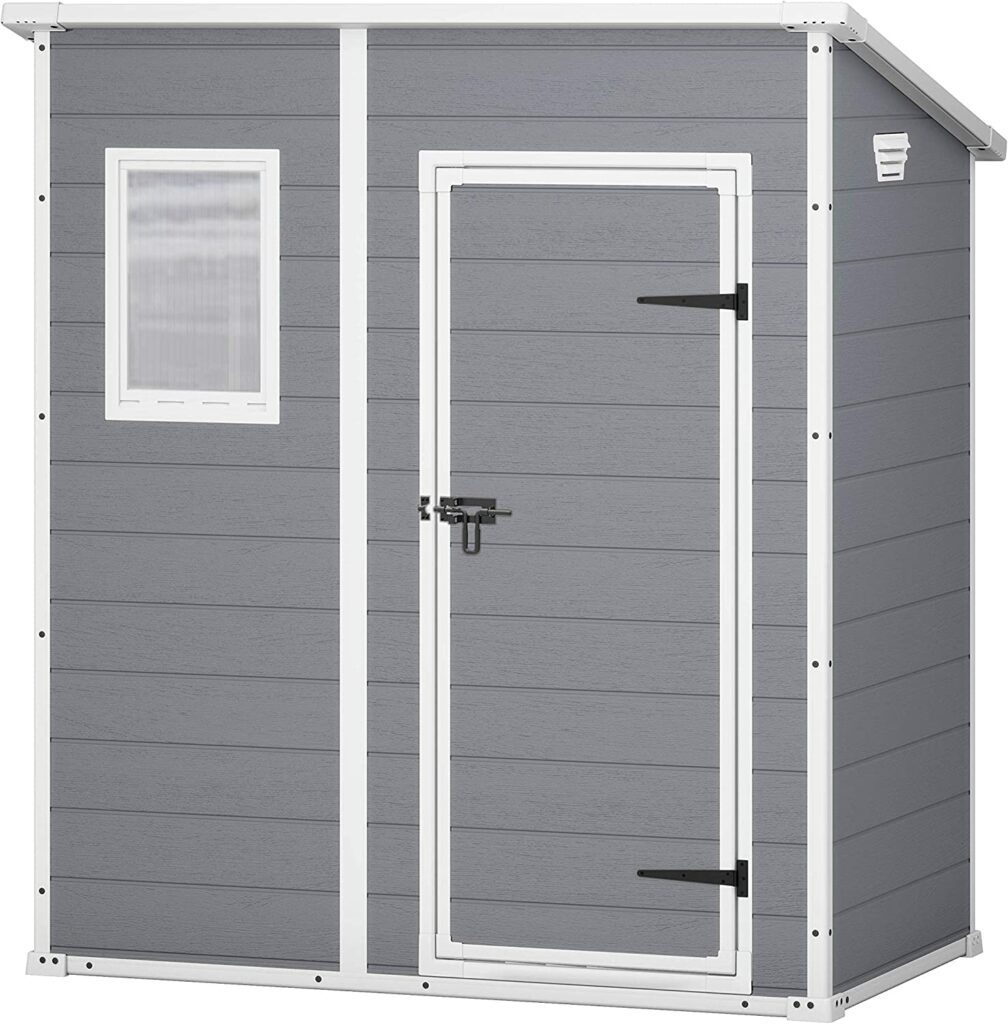 La casetta Manor Pent dispone di aperture che favoriscono la ventilazione e di una piccola finestra per permettere l’ingresso della luce. La porta è dotata di una maniglia in acciaio (non particolarmente robusto però) e ha un foro per il lucchetto, ma questo va acquistato separatamente.